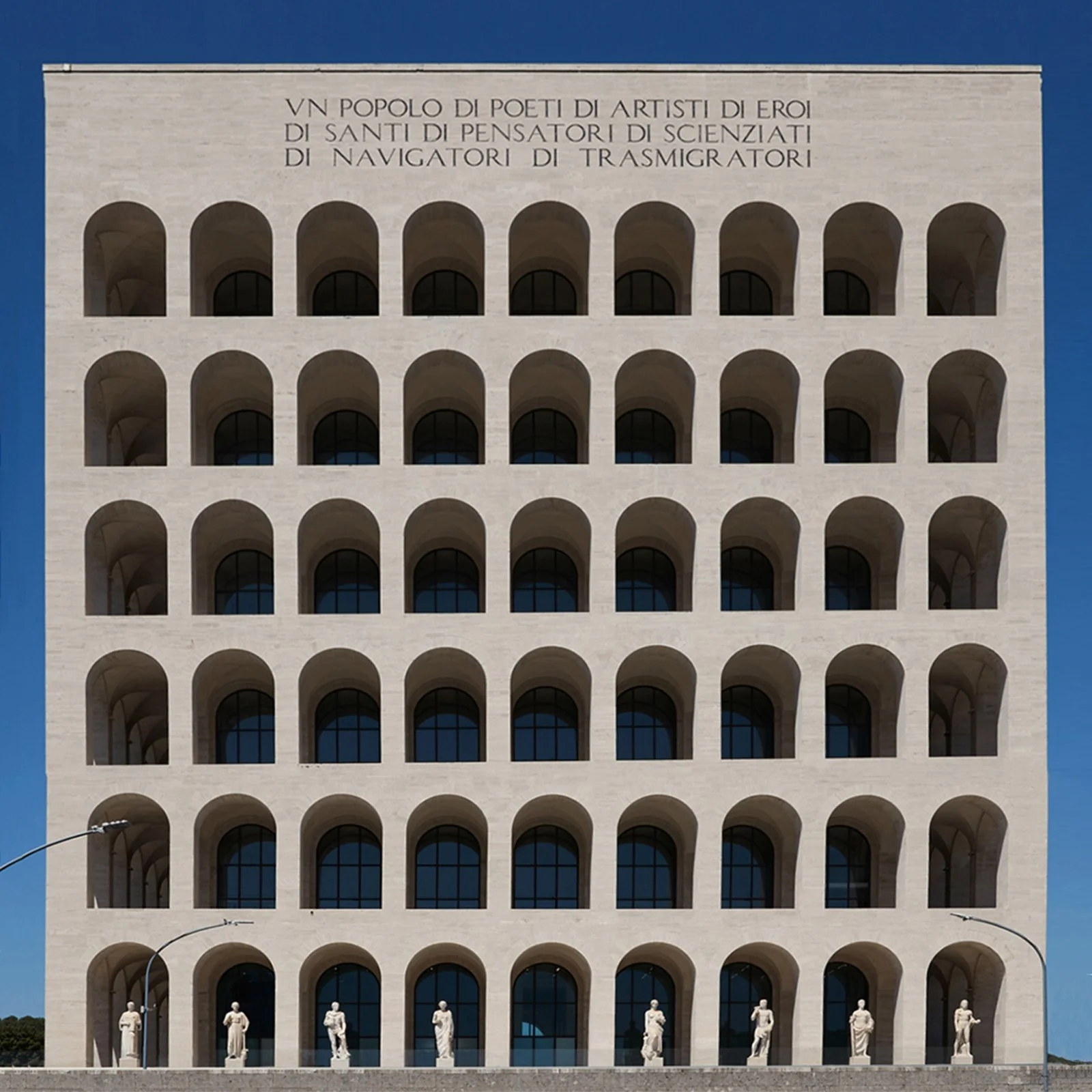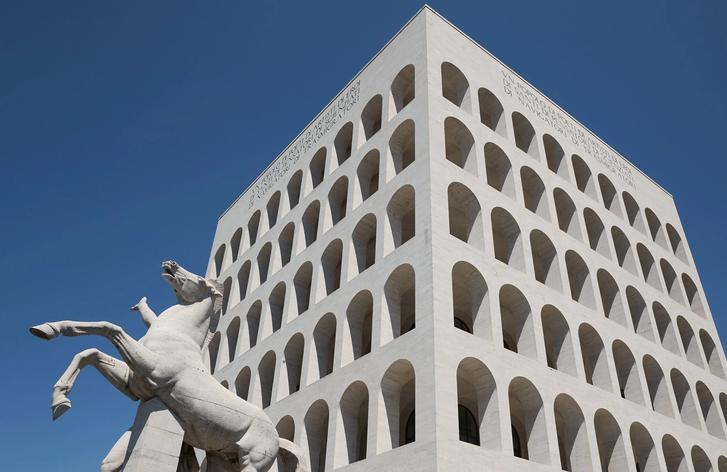 On all four sides of the building, the inscription “Un popolo di poeti, di artisti, di eroi, di santi, di pensatori, di scienziati, di navigatori, di trasmigratori” (in English: “A people of poets, artists, heroes, saints, thinkers, scientists, navigators, transmigrators”) is imprinted into the façade.